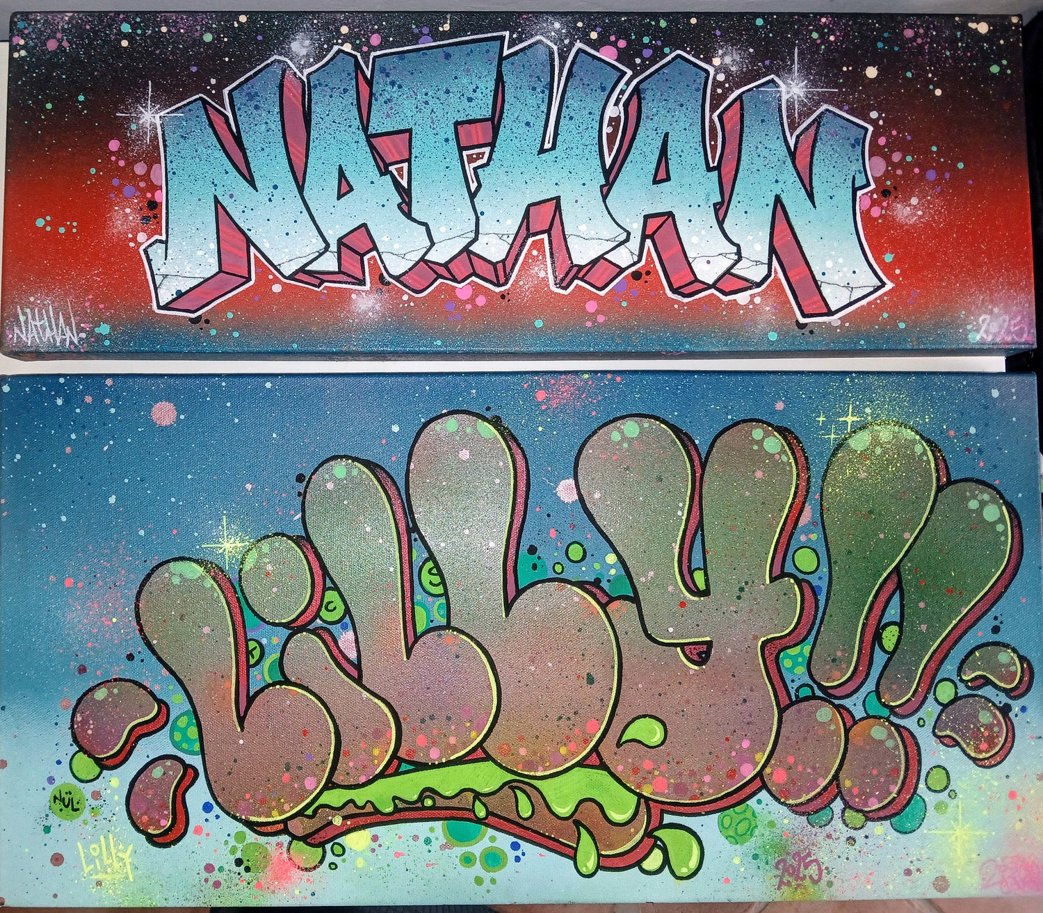 Spécialisés dans le graffiti personnalisé, nous créons des tableaux uniques ou chaque nom prend vie avec des couleurs vibrantes, des styles dynamiques et une touche urbaine authentique.